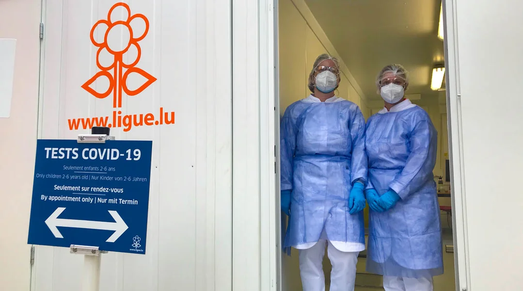 An deem klengen Haff, hannenaus riets beim Centre Médico-Social um Verluerekascht, stinn neierdéngs zwee wäiss Containeren: do ginn d'Tester gemaach. Et gëtt een duerch d'Säiten-Afaart dohinner guidéiert, fir nëmmen net duerch d'Gebai mussen ze goen.