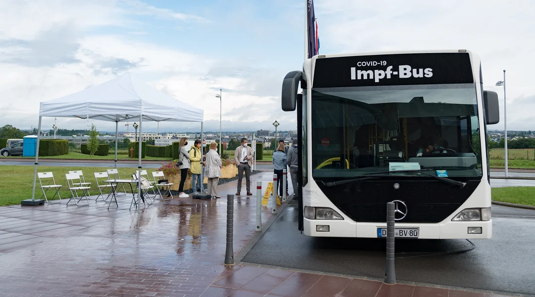 Zanter enger knapper Woch sinn d'Impfbussen ënnerwee fir am Gesondheets- a Fleegesecteur deene Leit ee Vaccin unzebidden, déi sech bis elo net impfe wollten oder konnten. Schätzungen no sinn iwwer déi lescht Woch eng 370 Leit iwwer dës mobil Impfméiglechkeet geimpft ginn. De Moien huet ee vun den zwee Busse beim Altersheem um Houwald Halt gemaach.