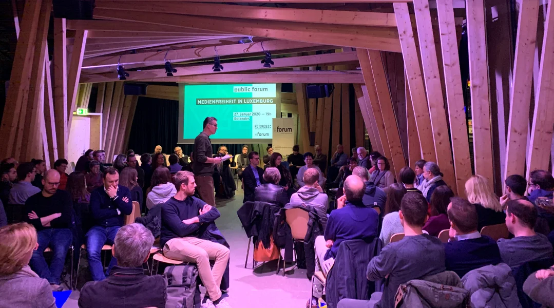 De Public Forum zum Thema "Medienfreiheit in Luxemburg" gouf vun der Zeitschrëft Forum organiséiert. Invitéiert ware Vertrieder aus der Lëtzebuerger Presselandschaft: