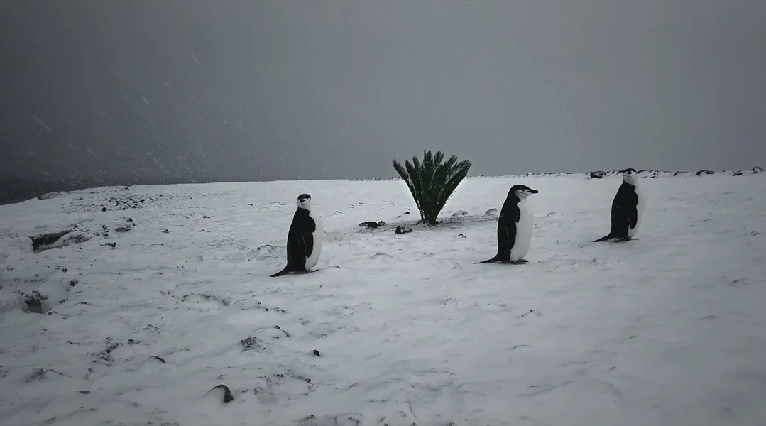 D'Kamera hëlt d'Positioun vun enger kënschtlecher Intelligenz an, enger net-mënschlecher Entitéit, déi als Drone iwwert déi wonnerschéin an onbewunnte Landschaft vu King George Island an der Antarktis schwieft. Eng primordial Landschaft, déi akut vum Klimawandel bedreet ass.