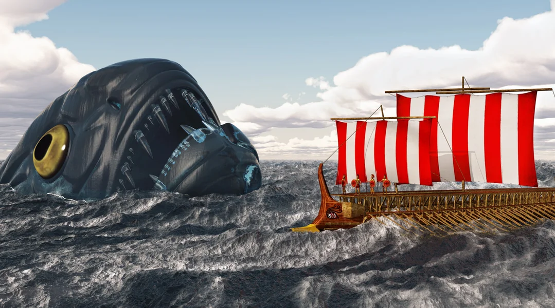 Zyklopen, an awer och Charybdis a Skylla si Monsteren, déi dem Odysseus d'Liewe schwéier maachen. Fantastesch Gestalten an enger reeller Geographie? D'Odyssee gëtt dacks als éischte Fantasy oder Science-Fiction Roman genannt.