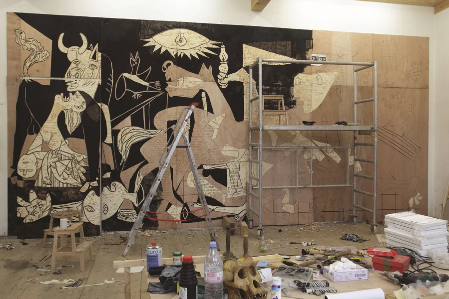 An der Tëschenzäit ass vill geschitt. No Konschtstudium zu Saint-Etienne an zu Karlsruhe, huet den Deroubaix laang Joeren zu Berlin gelieft, ier hien sech an der Lorraine, an der Glasstad Meisenthal, néiergelooss huet. Berlin wier him um Enn ze deier an ze geleckt ginn, sou de franséische Kënschtler. An der 750-Awunner-Gemeng Meisenthal konnt den Damien Deroubaix sech dann och komplett op de Picasso-Projet aloossen. Dobäi huet hien och d'Tapisserei vun deemools op seng Manéier nogemaach. "Ech wollt se net ofmolen, mee eng Technik benotzen, déi ech zanter 2009 vill gebrauchen, nämlech Gravure op Holz, déi herno gefierft an da rëm nei gravéiert ginn". Ze gesinn ass "Garage Days Re-visited", a vill aner Wierker vum Këntschler, aktuell am Mudam, bis den 29. Mee 2016.