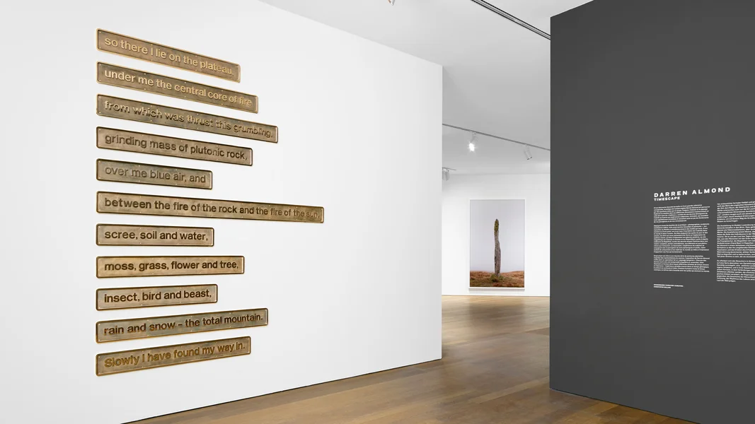 Gewëssermoossen als Introduktioun zu senger Ausstellung "Timescape" am Mudam, proposéiert den Darren Almond eng Serie vu metallene Placken op enger wäisser Wand. Doran aggravéiert ass e Gedicht. "Bei der Eisebunn a Groussbritannie war et Traditioun, datt all Lokomotiv en Numm hat. E ganze Reseau vu Maschinne mat Numm ass duerch d’Landschaft gereest. Benannt no allerlee Ingenieuren a Philosophen, mä et hat nach keng de Numm vun engem Kënschtler kritt." De Kënschtler erënnert sech drun, wéi en als Kand mam Zuch ronderëm dat ganzt vereenegt Kinneksräich gefuer ass. Et war fir hien eng Erfahrung vu Fräiheet. Zënter zwee Joerzéngte setzt den Darren Almond esou metalle Placken a sengen Ausstellungen an. Net mat Nimm drop, mä Texter, déi geduecht si fir dem Public vun der Ausstellung eng Denkpaus ze gënnen oder d'Leit duerch d'Ausstellung ze guidéieren. "1997 hunn ech gefrot, ob se net wéilten eng no mir nennen an dat hu se du gemaach."
