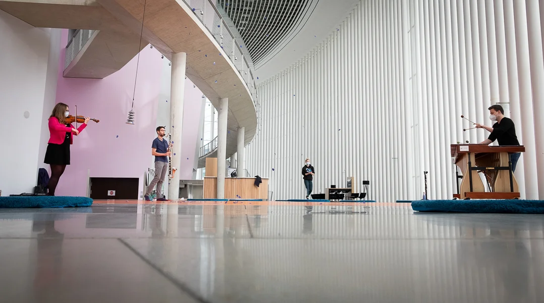 Et ass eng ongewinnt Situatioun: De Concert gëtt net an engem Sall organiséiert, mä am Foyer vun der Philharmonie. Fir d'éischt gesäit een eng ganz Partie ronn muusseg Teppecher um Buedem leien - Inselen op deenen all Kéiers zwee Erwuessener an zwee Kanner kënne sëtzen. Positionéiert sinn dës Teppecher ronderëm eng Zort Bün, déi just duerch orange Plane markéiert ass. Wärend d'Sonn tëschent de Saile vum Foyer era liicht, gesäit een, wéi dräi Museker op der Bün verdeelt spillen a sech tëschent hinnen eng Dänzerin hin an hir beweegt. Gläichzäiteg komme vun uewe blo Bléien erof gefall. Et ass eng Zeen, déi eppes Magesches u sech huet.