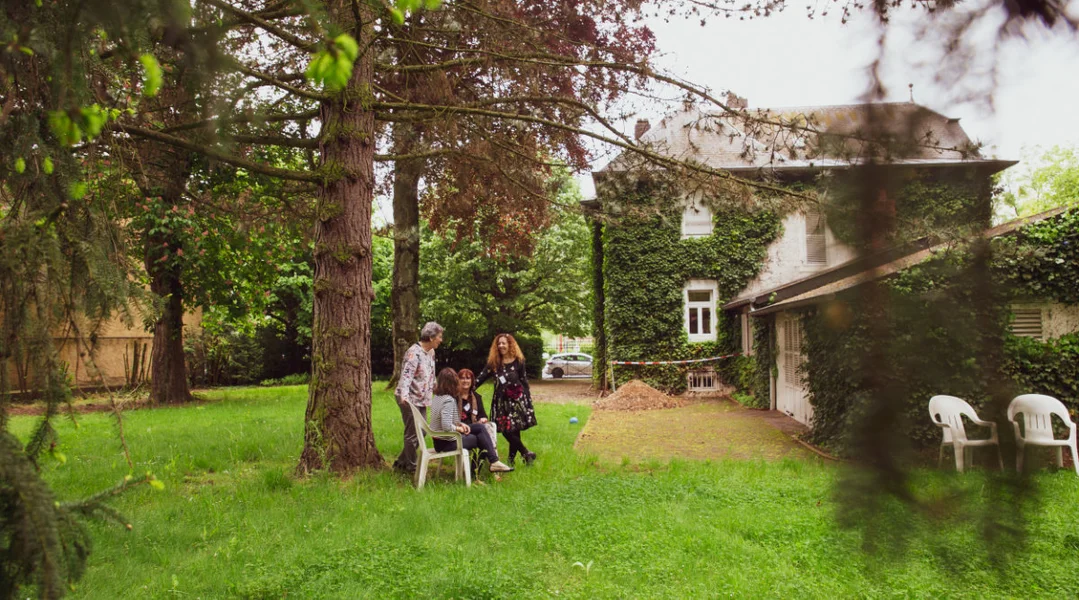 D'Membere vun dëser participativer Wunngemeinschaft diskutéieren zesummen, wéi hiert Doheem soll ausgesinn. An der aler Villa sinn d'Gemeinschaftsraim, wéi en Openthaltsraum an eng Kichen.