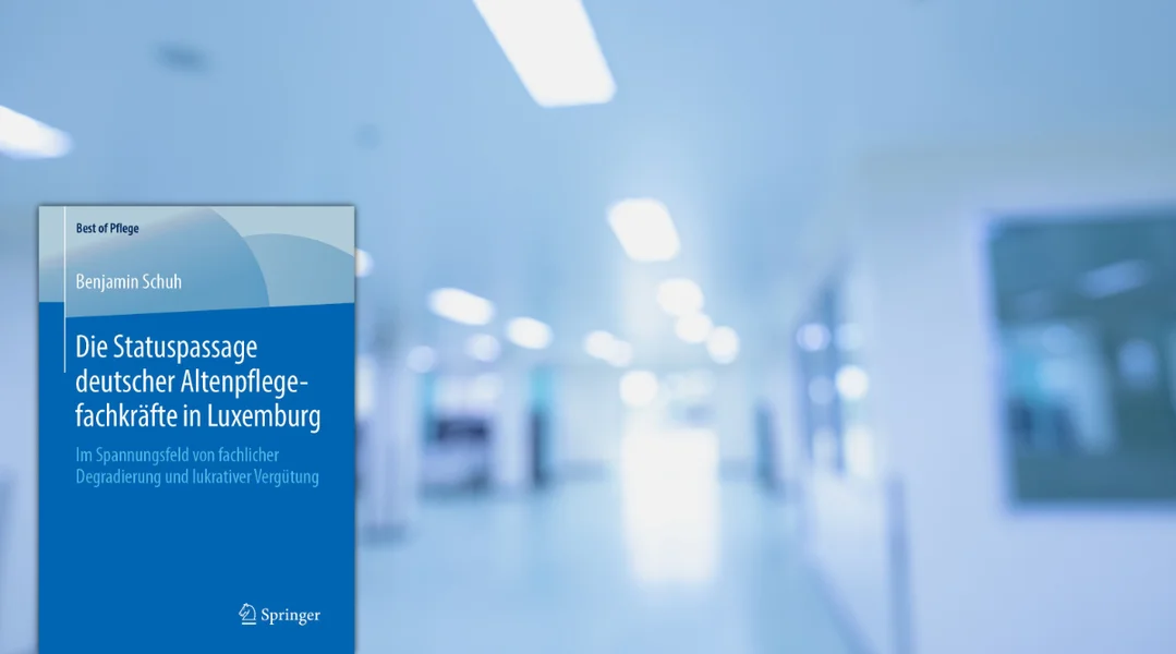 "Die Statuspassage deutscher Altenpflegefachkräfte in Luxemburg" - sou ass den Titel vum Benjamin Schuh senger Masteraarbecht aus dem Joer 2016, déi mat der Beschtnott ausgezeechent gouf a viru Kuerzem a Buchform publizéiert gouf. De jonke Chercheur interesséiert sech primär fir déi subjektiv Impressioune vun den däitschen Infirmieren a wëllt wëssen, wéi si de komplexe Statuswiessel erliewen, deen d'Ofwanderen op Lëtzebuerg mat sech bréngt. Dëse Statuswiessel geschitt u sech op zwee verschiddene Niveauen an huet souwuel Nodeeler wéi Virdeeler fir dat däitscht Fachpersonal.