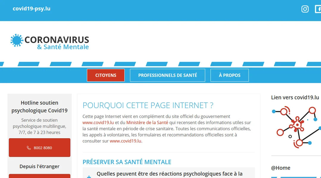 Wéi den offizielle Site vun der Regierung www.covid19.lu entstane wier, hätt ee festgestallt, datt do wéineg Informatiounen zu der mentaler Gesondheet ze fanne gewiescht wieren, esou de Fränz D'Onghia, Psycholog a Chargé de Direction beim Service Information et Prévention. Dofir ass an Zesummenaarbecht mam Gesondheetsministère d'Säit www.covid19-psy.lu entstanen.