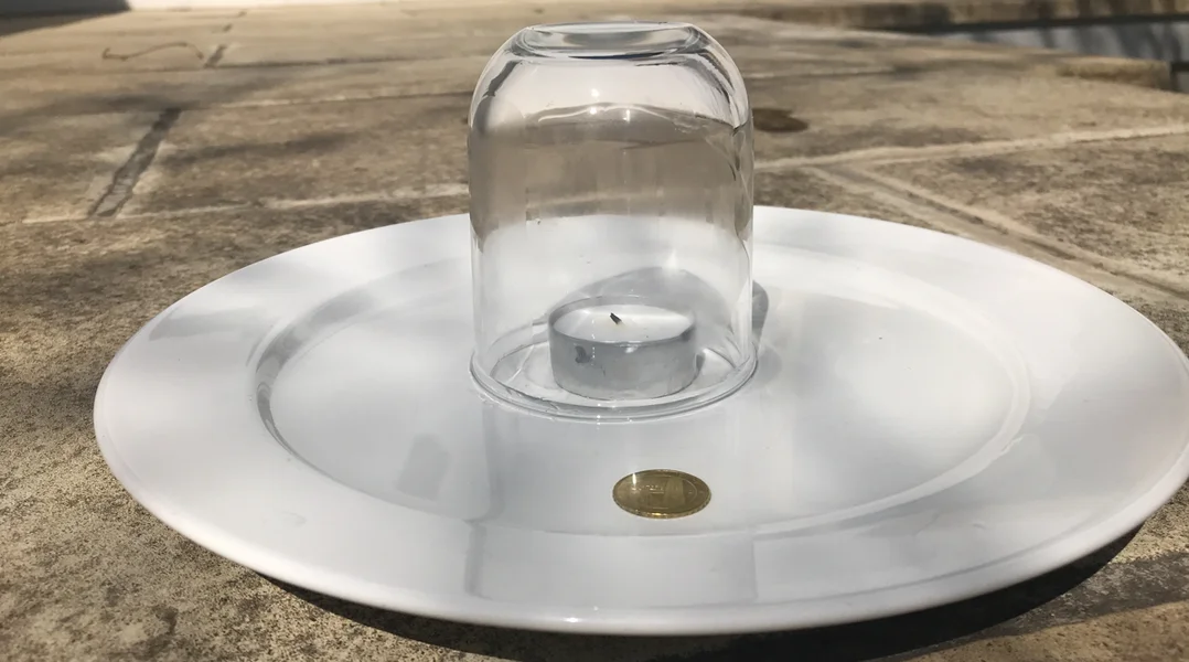 Et brauch een en Teller, eng Mënz, en Téiliicht, e Glas an e Fixspoun, a scho kann een zauberen. Behaapt einfach, datt dir déi Mënz, déi am Waasser um Teller niewent dem Téiliichtche steet, kënnt do erofhuelen ouni naass Fangeren ze kréien. Dir wësst net wéi dat geet? De Mister Science erkläert iech et.
