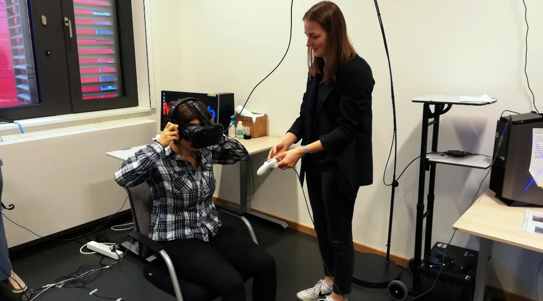 Een Eck vun dësem Labo ass fir d'Virtual Reality reservéiert. Hei féieren déi dräi Doktorandinne Katharina Rischer, Elisabeth Holl a Layla Battistutta zesumme mat der Master-Studentin Katharina Barcatta hir Etüd duerch. Si alle véier studéiere Psychologie. Wat si do genee maachen, erkläert d''Layla Battistutta: